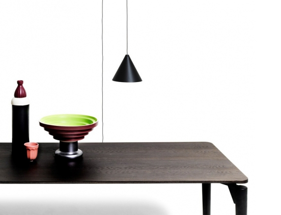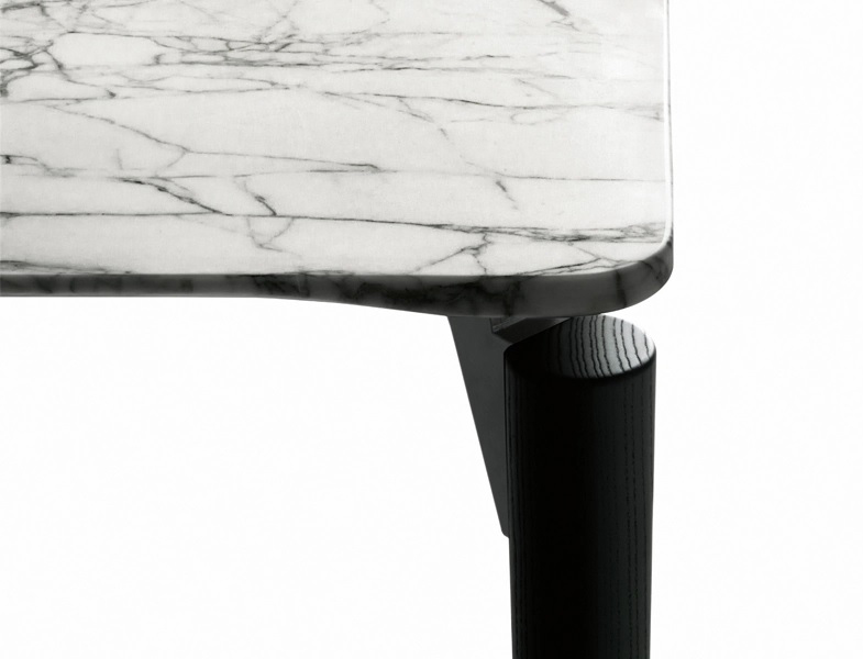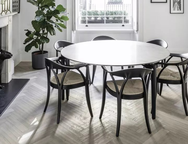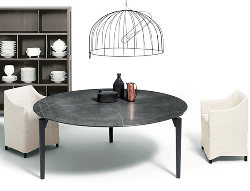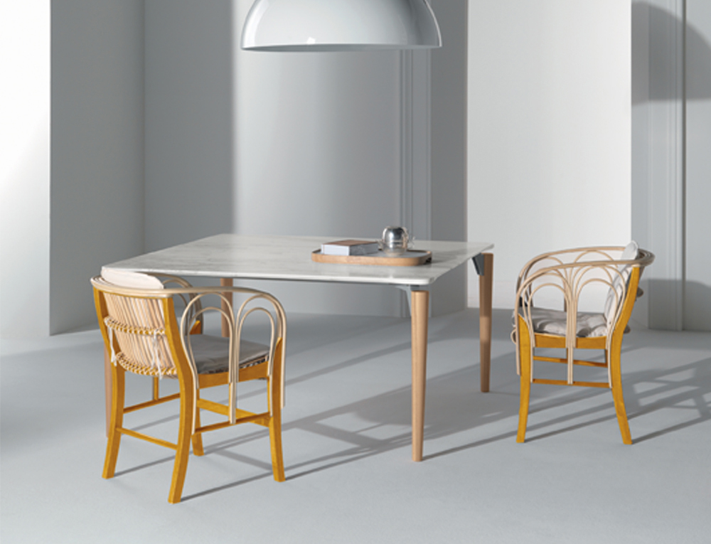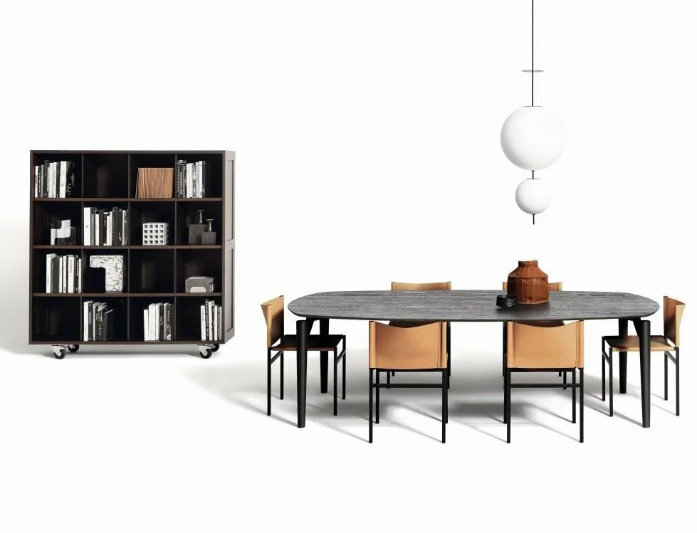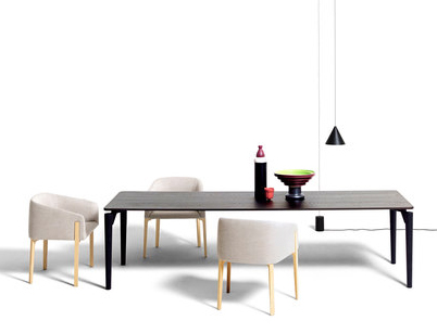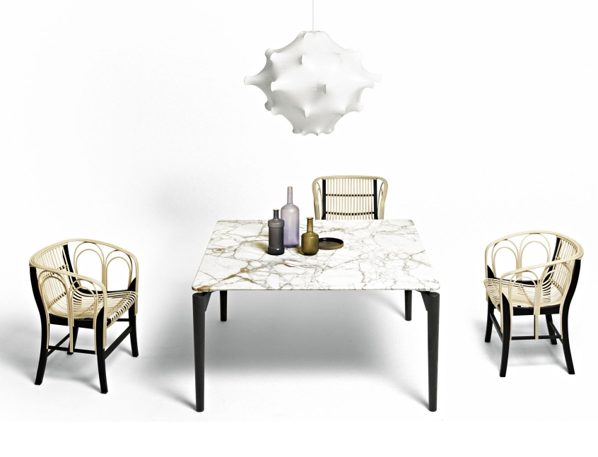 Modern, designer dining table with a marble or wooden tabletop and a slight frame.