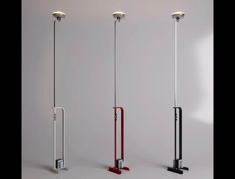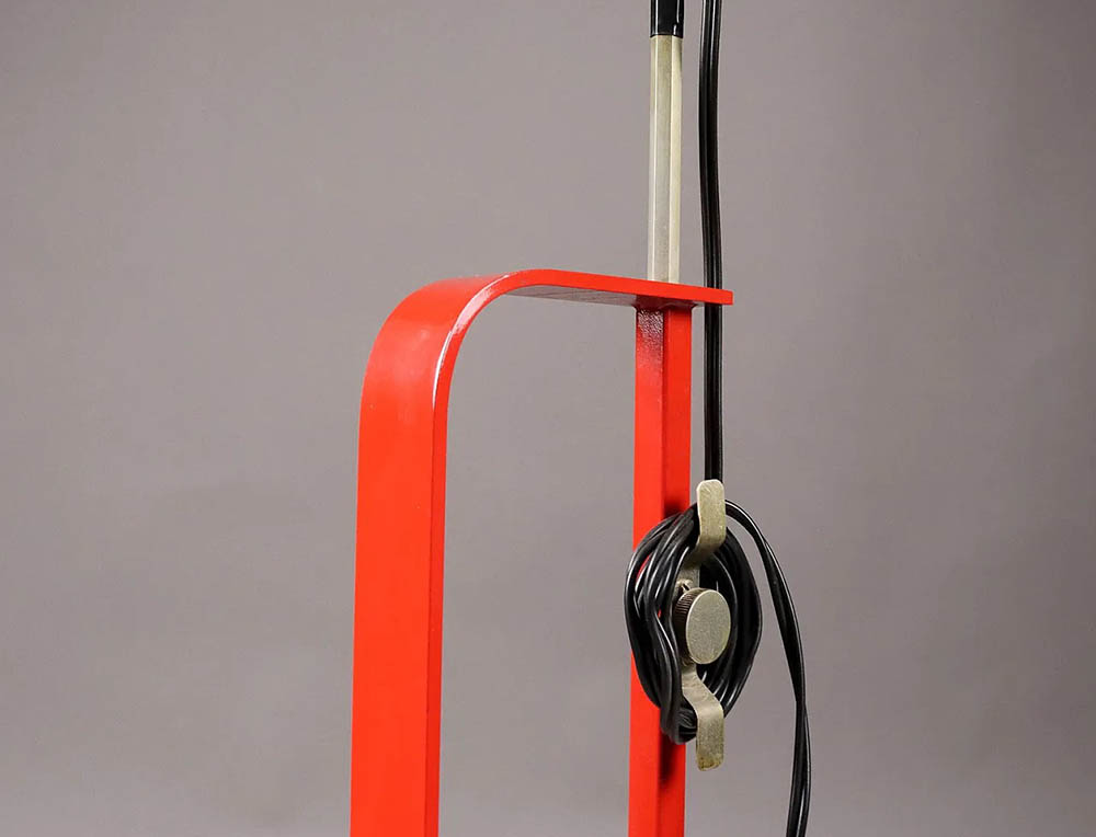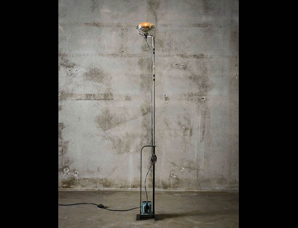 Floor lamp providing indirect lighting. Angle iron and formed steel base, painted in a variety of colors. Hexagonal nickel-plated brass height-adjustable stem with telescopic head. On the cable there is the electronic dimmer which allows the regulation of light brightness.